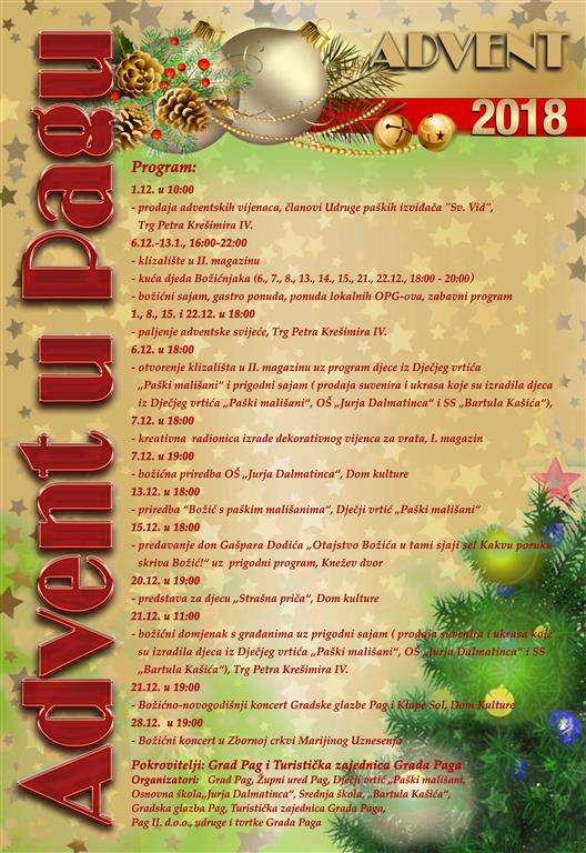 Advent u Pagu počinje paljenjem prve adventske svijeće na Trgu Petra Krešimira IV. u subotu 1.12. u 18:00 sati. Adventski program se sastoji od niza tradicionalnih glazbenih i scenskih priredbi, kreativne radionice, kazališne predstave, te zabavnog programa i gastro ponude u II. magazinu u kojem će od 6. 12. do 13. 1. biti otvoreno klizalište. Detaljnije o adventskim događanjima možete pročitati u nastavku.