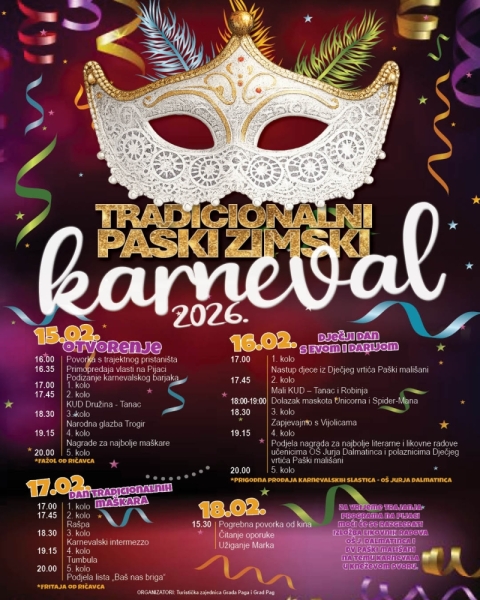 Od 14. do 18. veljače 2026. godine, grad Pag postaje središte karnevalskih zbivanja, ispunjen plesom, pjesmom, maskama i lokalnim običajima